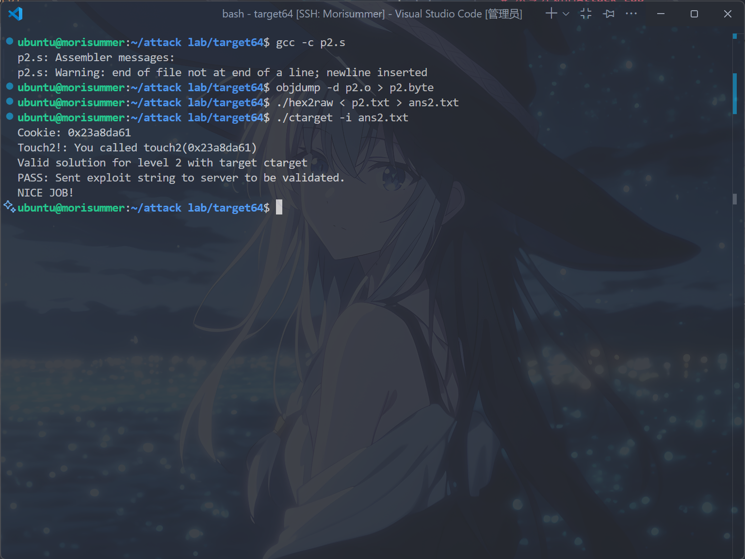 在这之外,有的phase还多了几步,需要先编辑好想进行攻击的汇编代码,再将其转化为十六进制编码gadget,找出gadget地址,将它编写进十六进制文件。