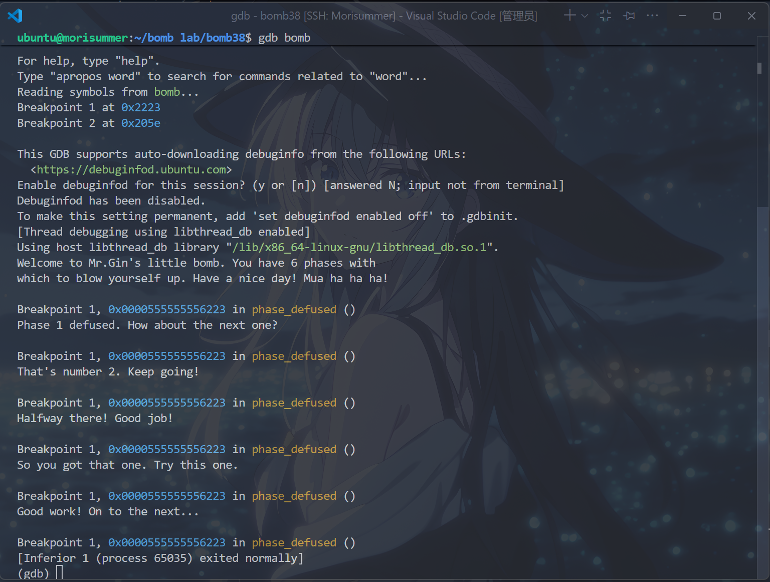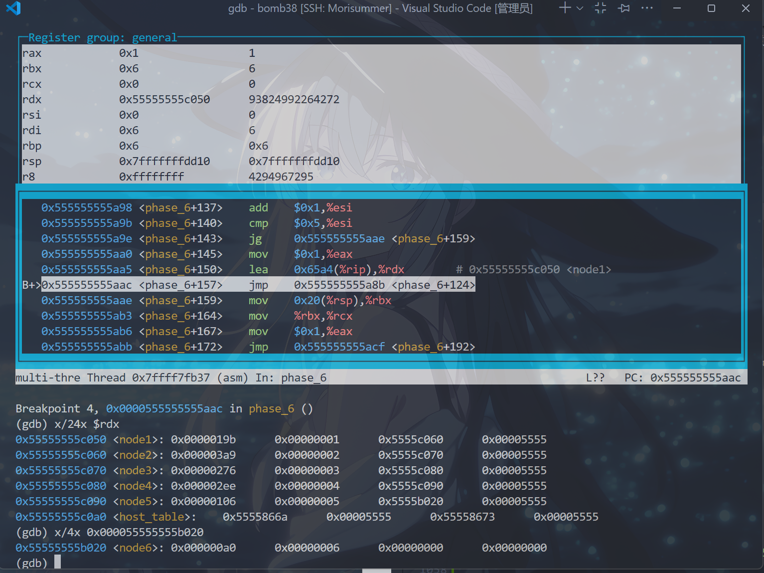 将psol.txt的第六行替换为答案,注释掉b phase_6,打开终端,运行以下命令: