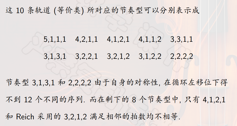 - 对于每个音列,按照上述方法都可以求出一个相应的时值序列 $(d_0,d_1,\ldots,d_{11}),0 \leq d_i \leq 11$
